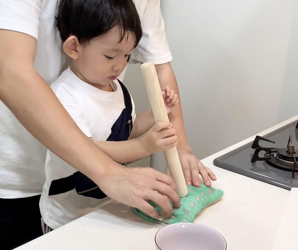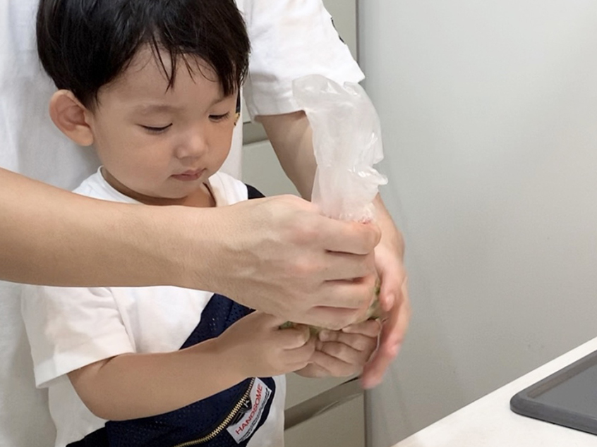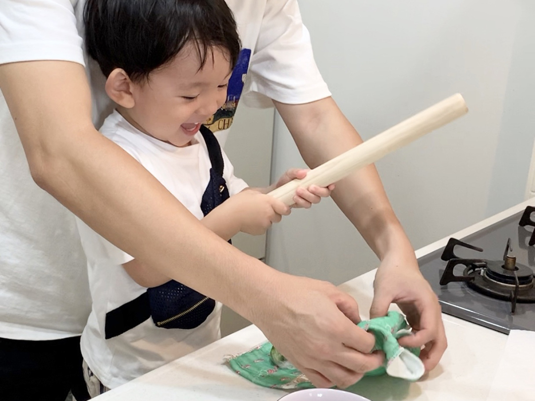 • たたくというのは、2歳くらいからできるお手伝いです。たたくことで、断面がぎざぎざになって味がからみやすくなります。