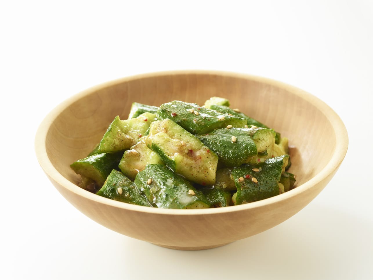 きゅうりはすりこぎなどの棒で軽くたたき、食べやすい大きさにちぎり、調味料と和える。