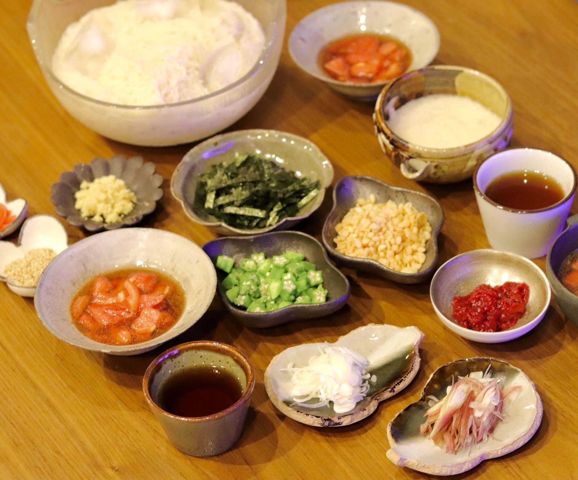 - トッピングは他にも、レモン汁、山芋すりおろし、溶き卵、梅干し、納豆などもおすすめ。具沢山のたれは、おかず代わりになります。