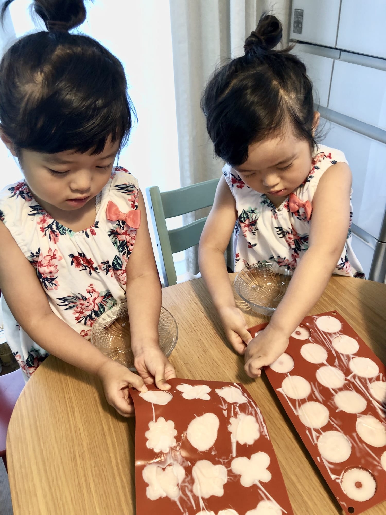• 何度も冷凍庫を開けるのはよくありませんが、ちゃん固まっているかを確認するところも料理(お手伝い)。子どもにタイマーをセットしてもらい、完成するところまで見守りましょう。