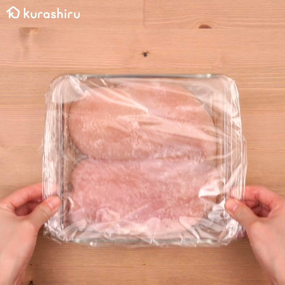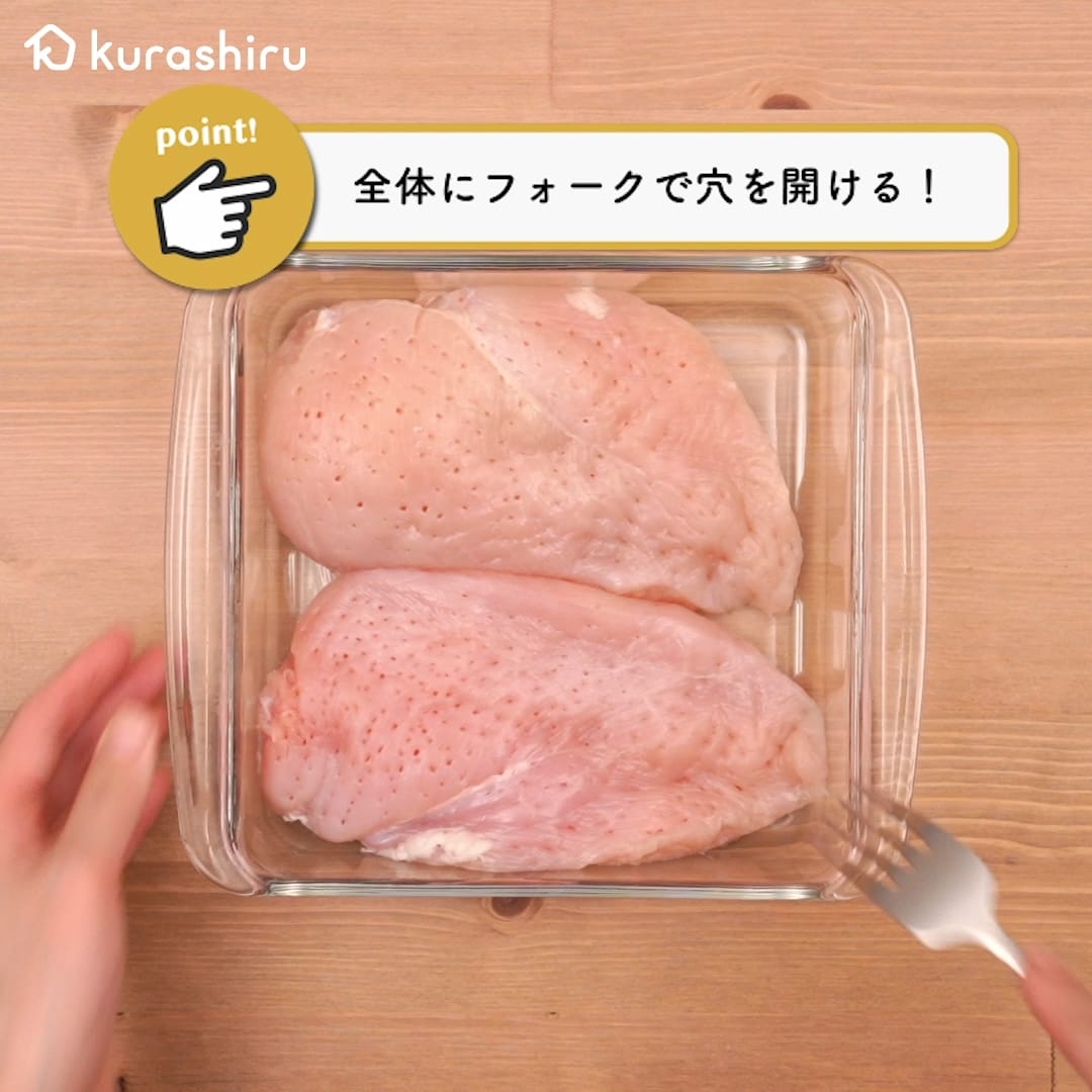 1.耐熱容器に鶏むね肉を入れ、フォークで全体に穴を開けます。