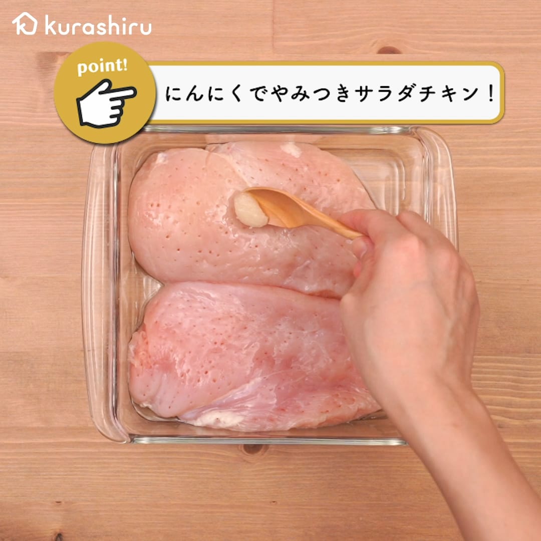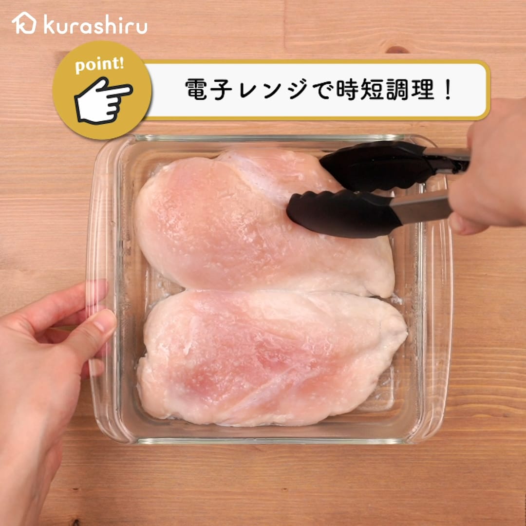 調味料を揉みこんでレンジで加熱するだけであっという間にしっとりとしたサラダチキンが作れます。イタリアンハーブミックスや味付カレーパウダー バーモントカレー味などもみこむ調味料を変えることで、味付けのアレンジも自在!