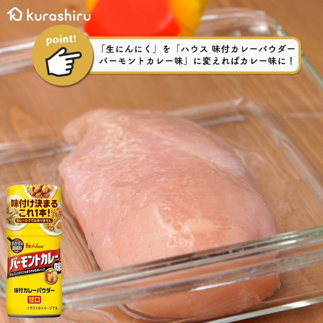 「ハウス 特選本香り 生にんにく:大さじ1」を「ハウス 味付カレーパウダー バーモントカレー味:大さじ1」に変更するとカレーサラダチキンに!
