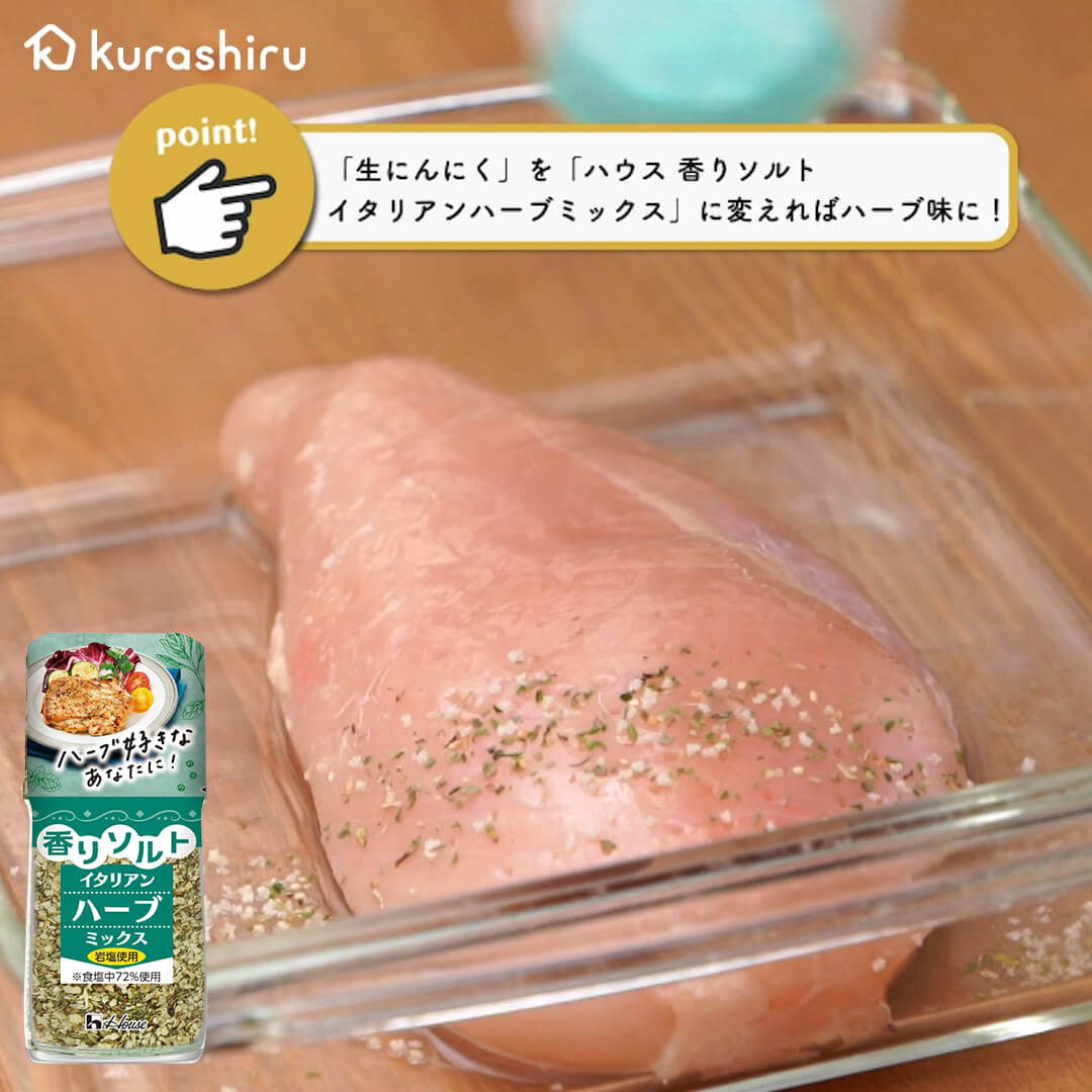 「ハウス 特選本香り 生にんにく:大さじ1」「ハウス 香りソルト <イタリアンハーブミックス>:小さじ2」に変更するとハーブサラダチキンに!