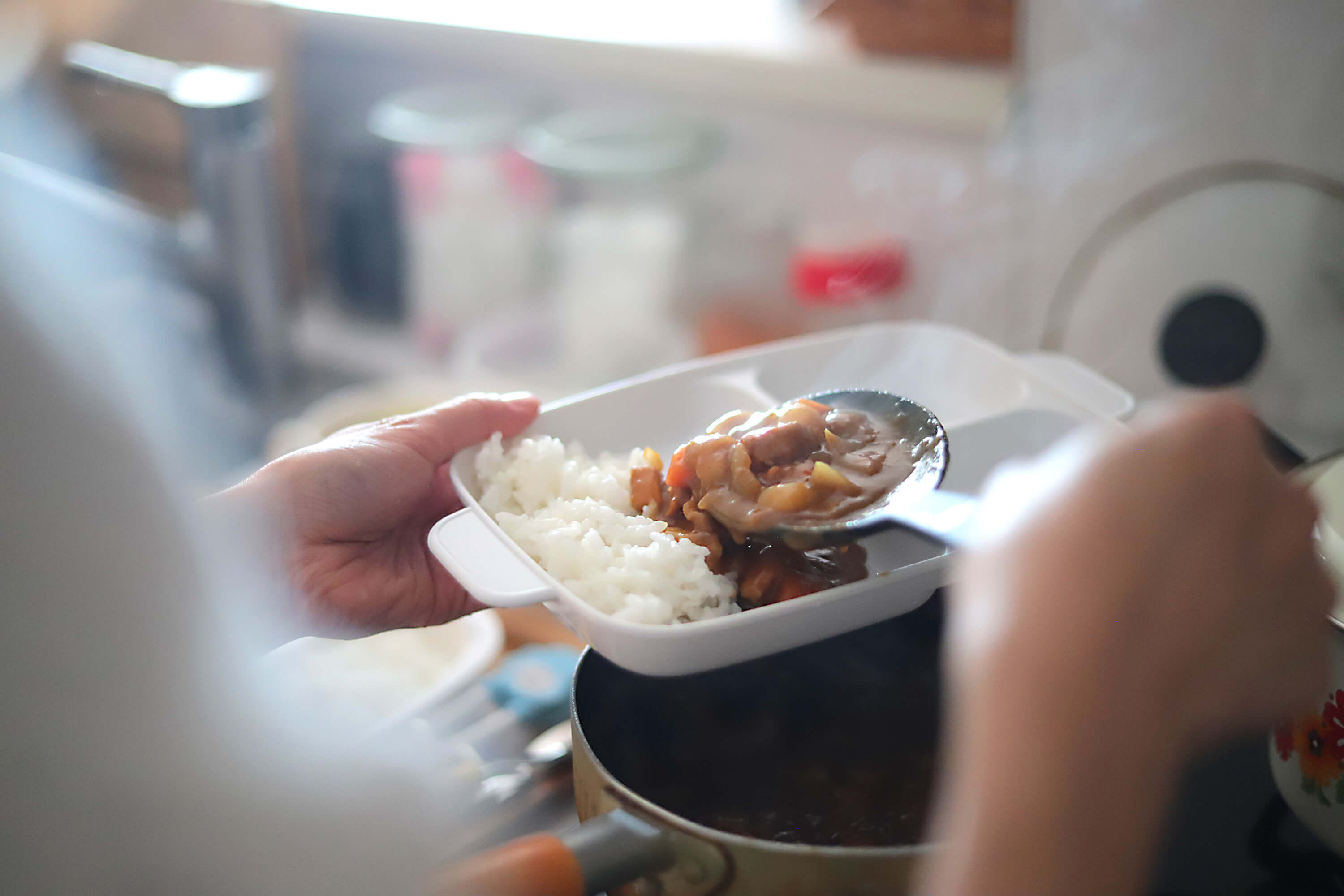 こばもえ:普段は子どもと大人は別メニューですが、肉じゃがやクリームシチューなど同じものを食べる日は、器によそってからキッチンバサミで一口大にしています。子ども向けの平日ごはんは具だくさんスープ+丼(うどんのことも)が基本。スープは朝イチで仕込み、野菜をくたくたに柔らかくしておくのがポイントです。